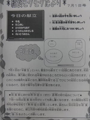7月~9月は給食室の中がとても蒸し暑くなります。その期間は市川市内の学校全校「熱中症0週間」とします。皆さんに安心安全な給食を届けるために、献立内容や使用食器の枚数を変更します。