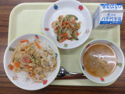 今日の献立は、鶏の唐揚げ、切り干し大根煮、ごはん、もずくスープ、牛乳です。