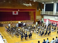 昨日雨のために延期となった運動会の全校練習を実施しました。前半は4年ぶりに行う大玉送り練習をしました。なかなか大玉を送るのが難しかったようですが、みんなとても盛り上がりました。また、後半は応援練習を行いました。吹奏楽の演奏に合わせて応援団が入場し、三三七拍子や応援歌など久しぶりに大きな声が校庭響いていました。