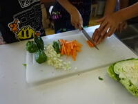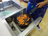 6年生が家庭科の調理実習で野菜の炒め物に取り組んでいます。炒める野菜を慎重に切り、最初は不安そうに痛めていました。学級によってはツナを具材として加えるなど工夫していました。最後に試食をしました。味付けは塩コショウのみでしたが、どの学級の子ども達も自分たちが作った炒め物をおいしそうに食べていました。