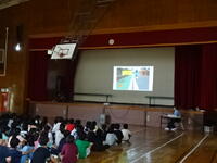 1年生と3年生が交通計画課の方をまねいて、交通安全教室を実施しました。1年生は主に道路での歩き方について、3年生は自転車の乗り方について動画や実演を見ながら学習しました。道路を歩く時の合言葉「とまる みる まつ」、また自転車点検の合言葉、「ブタはしゃべる」(ブレーキ、タイヤ、反射板、車体にまたがって足が着くか、ベル)などたくさん教えていただきました。ぜひ、これから実践していってほしいです。