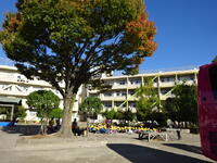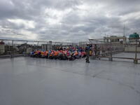 24日の4時間目に避難訓練を実施しました。今回は、新浜幼稚園と合同での津波対応の避難訓練と位置づけ、地震で校庭に避難した後、屋上に避難しました。