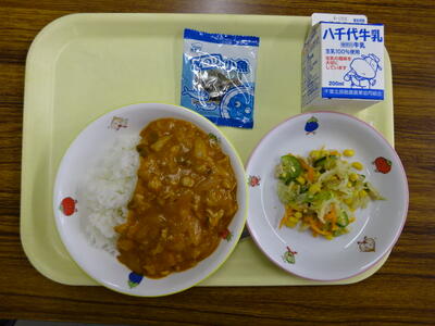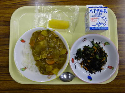 ・ごはん ・ポークカレー ・ひじきのマリネ ・冷凍パイン ・牛乳