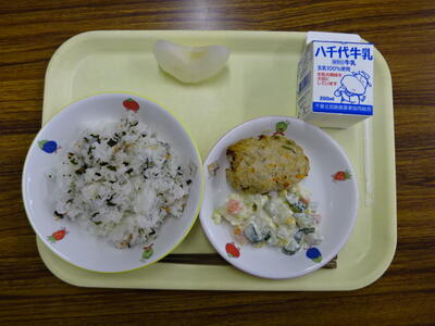 ・鮭わかめごはん ・和風ハンバーグ ・マセドアンサラダ ・梨 ・牛乳