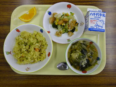 ・カレーピラフ ・コロコロサラダ ・ABCスープ ・オレンジ ・牛乳