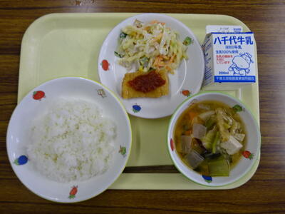 ・ごはん ・イカのチリソースかけ ・マカロニサラダ ・さつま汁 ・牛乳