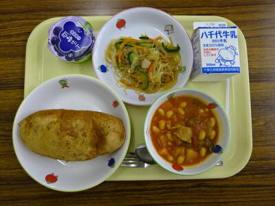 ・きな粉揚げパン ・春雨サラダ ・ポークビーンズ ・ぶどうゼリー ・牛乳
