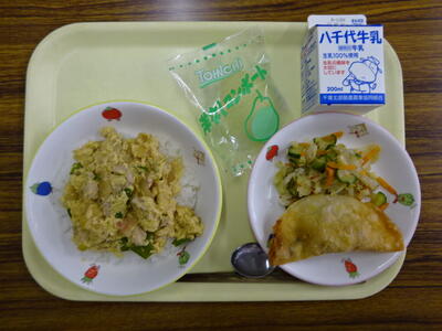 ・回鍋肉丼 ・小松菜のあえもの ・リンゴケーキ ・牛乳