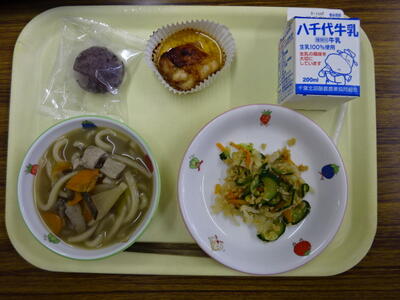 ・けんちんうどん ・鳥の照り焼き ・大豆和え ・おはぎ ・牛乳