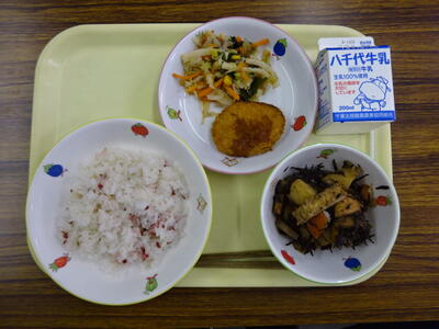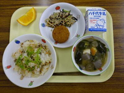 ・きつねごはん ・里芋のコロッケ ・ナムル ・五目汁 ・オレンジ ・牛乳