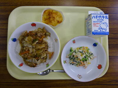 ・回鍋肉丼 ・小松菜のあえもの ・リンゴケーキ ・牛乳