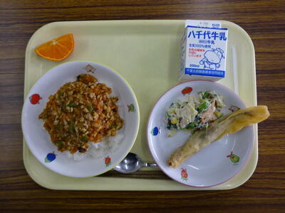 ・そぼろ丼 ・ししゃもの変わり揚げ ・小松菜のあえもの ・オレンジ ・牛乳