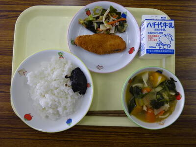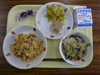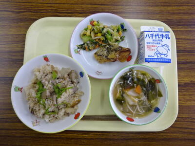 ・里いもごはん ・鯖の竜田揚げ ・ごまあえ ・味噌汁 ・牛乳