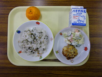 ・鮭わかめごはん ・和風ハンバーグ ・マセドアンサラダ ・ポンカン ・牛乳