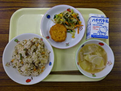 ・ご飯 ・鶏肉の唐揚げ ・けんちん汁 ・納豆あえ ・牛乳