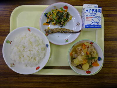 ・ご飯 ・いわしのサンガ焼き ・きのこけんちん汁 ・しらすの和風サラダ ・牛乳