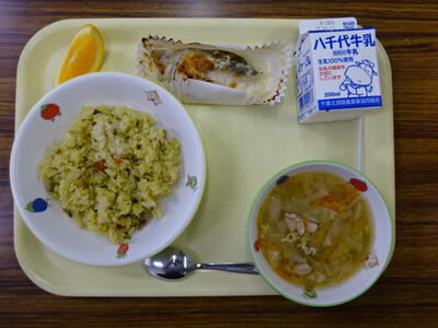 ・カレーピラフ ・白身魚のチーズ焼き ・ABCスープ ・オレンジ ・牛乳