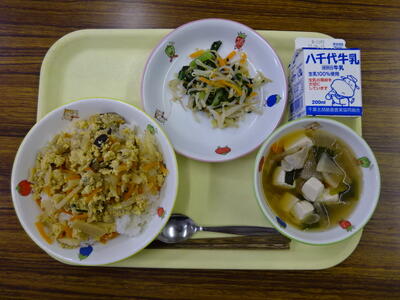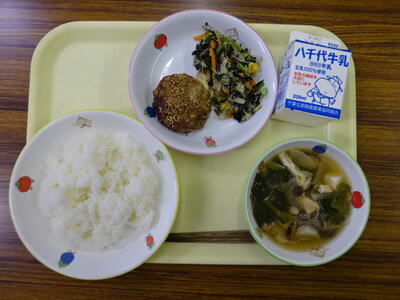 ・ひじきご飯 ・和風卵焼き ・味噌汁 ・青菜としめじの和え物 ・牛乳