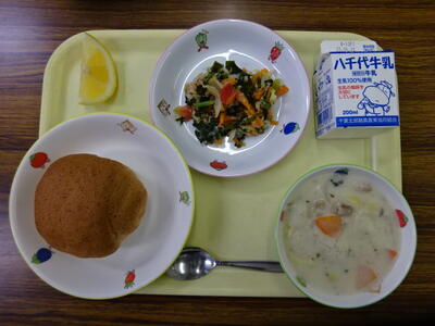 ・胚芽パン ・マカロニのクリーム煮 ・海藻サラダ ・小夏 ・牛乳