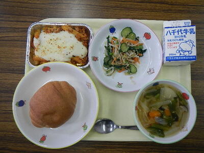 ・胚芽パン ・ラザニア ・白菜としめじの野菜スープ ・ツナ和え ・牛乳