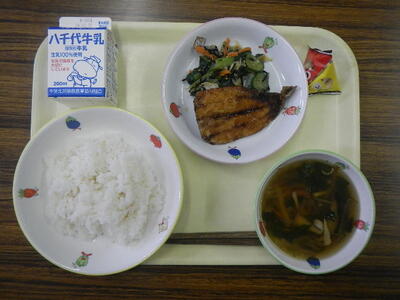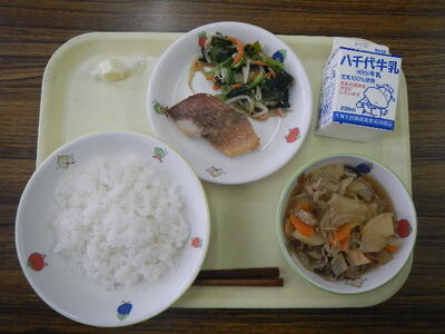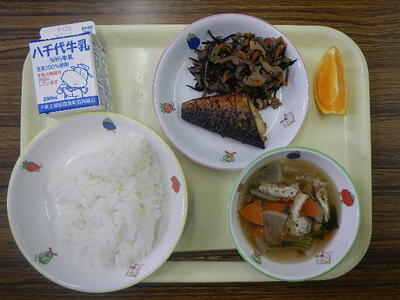 ・ご飯 ・鯖のカレー焼き ・けんちん汁 ・根菜とひじきの炒め物 ・オレンジ ・牛乳
