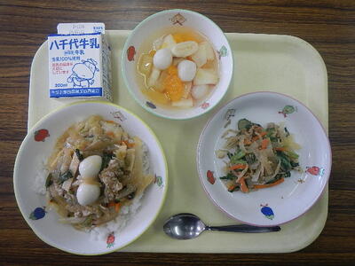 ・五目あんかけご飯 ・チャーシューナムル ・フルーツ白玉ポンチ ・牛乳