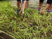 社会科の授業の一環で、5年生が校庭で育てた稲の、稲刈りを行いました。