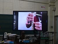 3年生のリコーダーの授業では、教員がタブレットを活用してリコーダーの手元を大型モニターに映して子ども達に提示しています。これにより、指使いを確認しながら練習することができています。