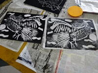 4年生が版画に取り組んでいます。11月に彫刻刀の使い方を学習し、富士山や鳥など思い思いの作品を作っています。ちなみに、今回の版画板の素材は木ではなく、プラスチックのような素材でできた版画版で作成しています。木目がないのでとても彫りやすそうです。