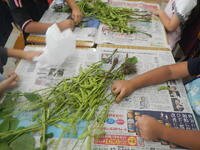 1年生が、給食で食材として使用する枝豆の枝もぎを手伝ってくれました。説明を聞いてから、さっそく枝もぎをはじめましたが、みんなとっても上手に手際よく枝豆を枝からとってくれてたので、あっという間に全校分の枝豆を用意できました。ありがとうございました。