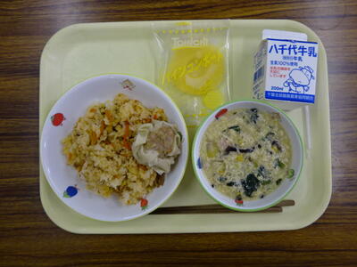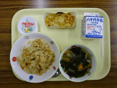 ・ガーリックライス ・豆腐グラタン ・白玉スープ ・メロンゼリー ・牛乳