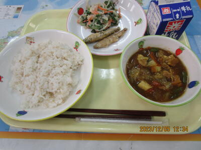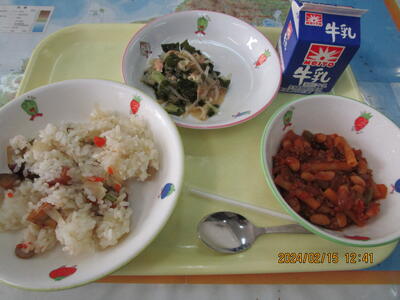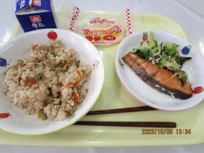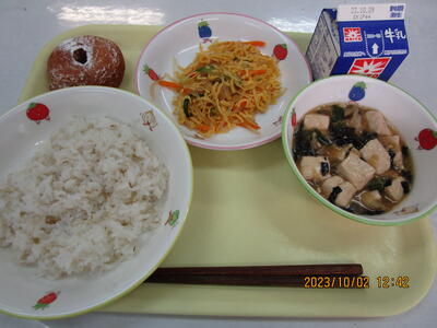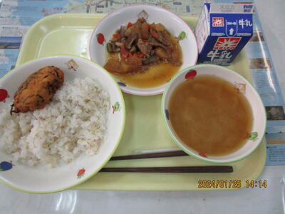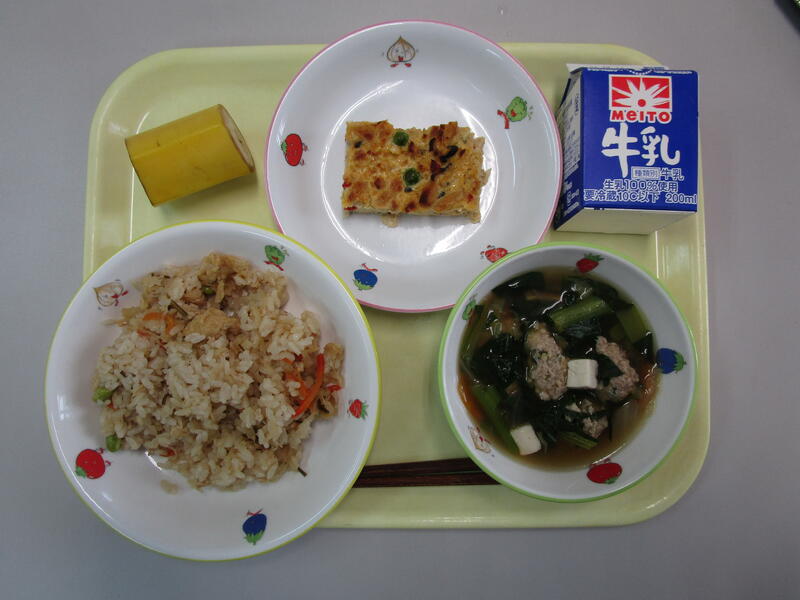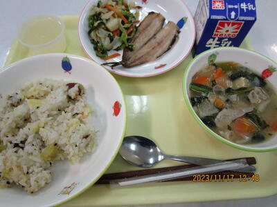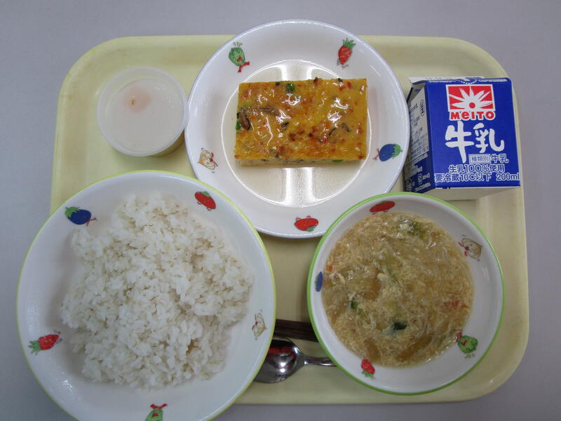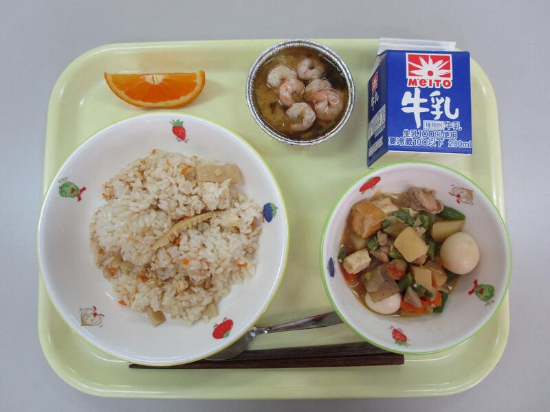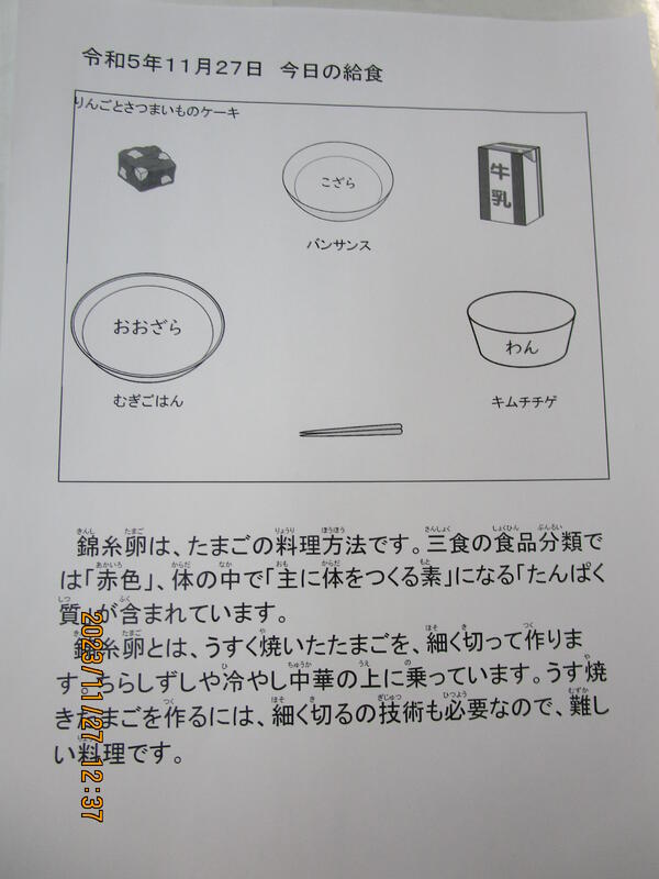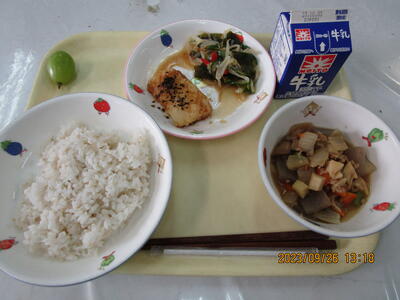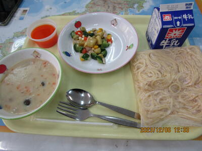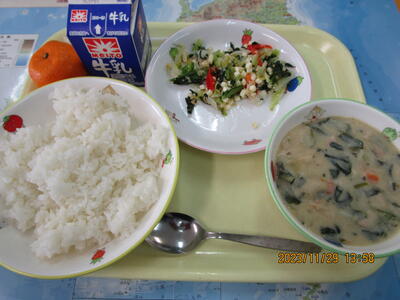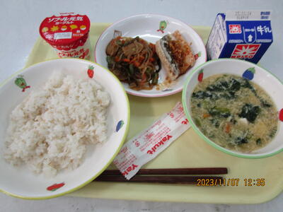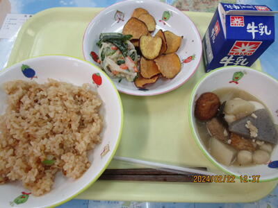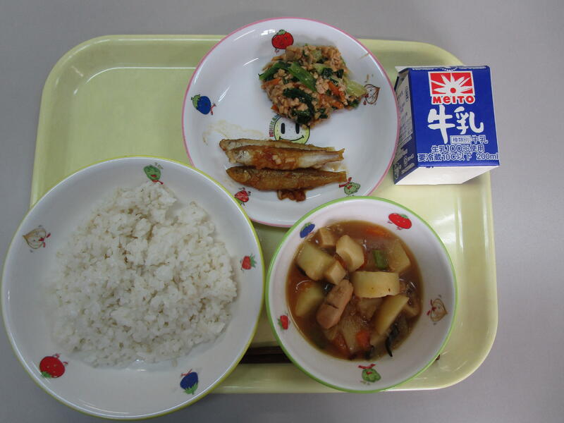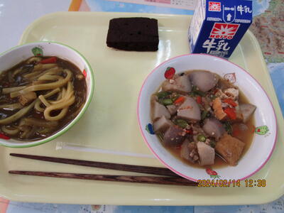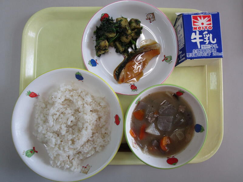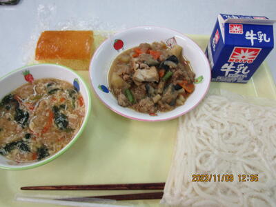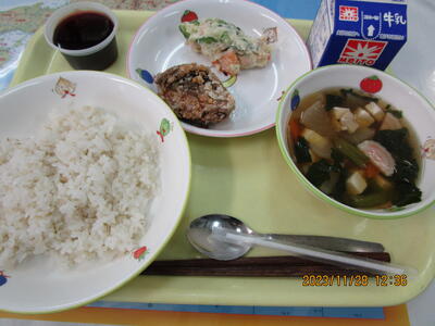 「けんちんうどん」「ちくわの磯辺揚げ」「胡麻和え」「おはぎ」「牛乳」