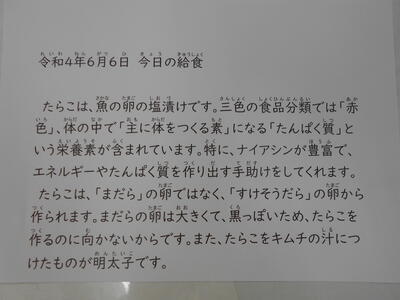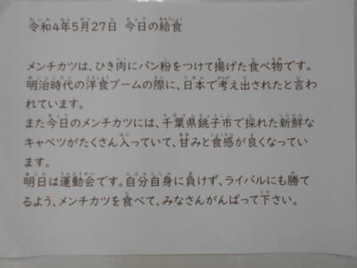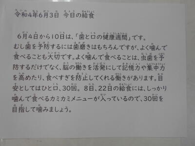 毎日の「給食もりつけ表」を各教室に掲示してます。