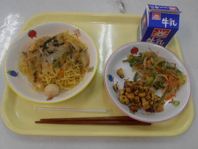 「あんかけ焼きそば」「さつまいもと大豆のかりん上げ」「くきわかめのナムル」「牛乳」