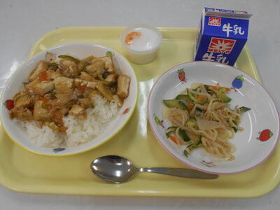 「ごはん」「チンジャオロース丼の具」「サンラータン」「あまなつゼリー」「牛乳」