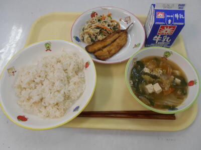 「麦ごはん」「レンコンいりつくね汁」「イワシのかば焼き」「油揚げと小松菜のみそマヨ和え」「牛乳」