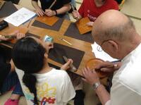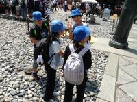 防火衣着装体験では、消防士さんが実際に普段着装している防火衣を、わずか30秒で着替えるという早業を披露していただきました。その後、子供用の防火衣を実際に着せてもらい、ヘルメットの重さや着装の難しさを体験しました。