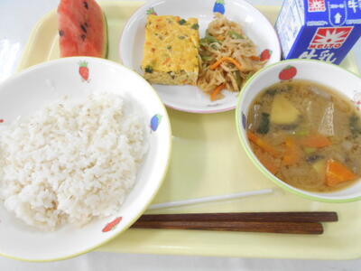 「麦ごはん」「さつま汁」「擬性豆腐」「切り干し大根煮」「スイカ」「牛乳」