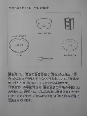 4月14日(金)本日の給食 投稿日時 : 2023/04/17 大柏小学校管理者 「マーボー丼」「中華サラダ」「杏仁豆腐」「牛乳」 Tweet {{options.likeCount}} {{options.likeCount}} {{options.unlikeCount}} {{options.unlikeCount}} 0 コメント