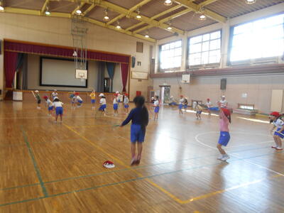 1年 体育 フラフープを使って縄跳びの前跳びのように跳び越えます!