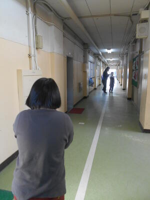 糸電話を使うと、こんなに離れていても話声がよく届きます。楽しそうに実験していました。