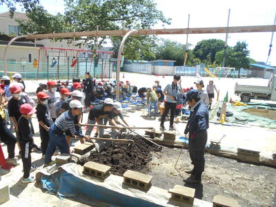 訓練場見学では、実際に訓練を行っている様子を見せてもらいました。本当の火事の現場を想定した訓練で、消防士の素早い行動に、子どもたちは大変驚いていました。