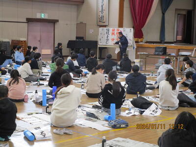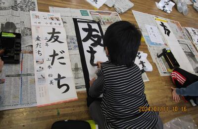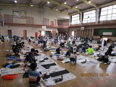 今日は、1・2校時に3年生、3・4校時には6年生が書初めを行いました。学年全員が体育館に集まっての実施です。