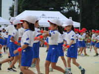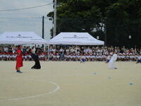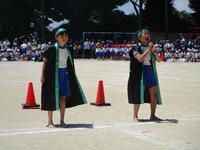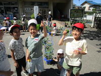 防火衣着装体験では、消防士さんが実際に普段着装している防火衣を、わずか30秒で着替えるという早業を披露していただきました。その後、子供用の防火衣を実際に着せてもらい、ヘルメットの重さや着装の難しさを体験しました。