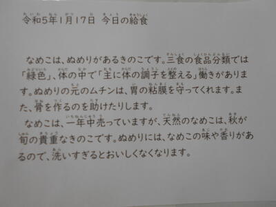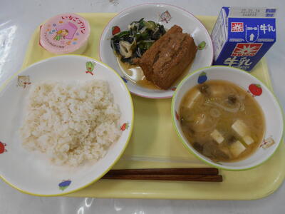「麦ごはん」「なめこ汁」「生揚げのツナ詰め煮」「さんばいず」「いちごプリン」「牛乳」