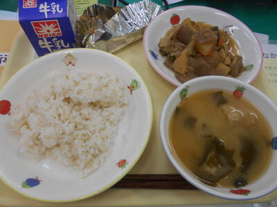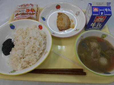 「麦ごはん」「だまこ汁」「味のみそ照り焼き」「市川産ののりの佃煮」「おこめdeメープルマフィン」「牛乳」