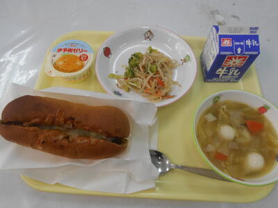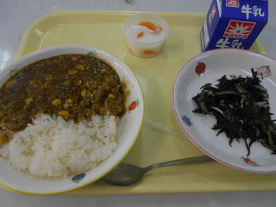「コーンキーマカレー」「ひじきのマリネ」「牛乳ゼリー」「牛乳」