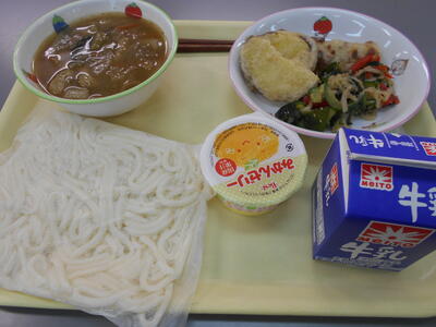 「ピリ辛みそうどん」「てんぷら(ちくわ、さつまいも)」「ブロッコリーのごまあえ」「みかんゼリー」「牛乳」