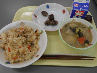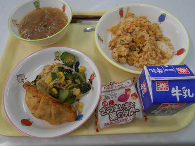 「キムチチャーハン」「はるさめスープ」「揚げ餃子」「わかめとコーンのサラダ」「おこめdeさつまいもタルト」「牛乳」