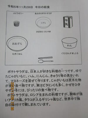 11月29日(水)本日の給食 投稿日時 : 2023/12/01 大柏小学校管理者 0 {{options.likeCount}} {{options.likeCount}} {{options.unlikeCount}} {{options.unlikeCount}}